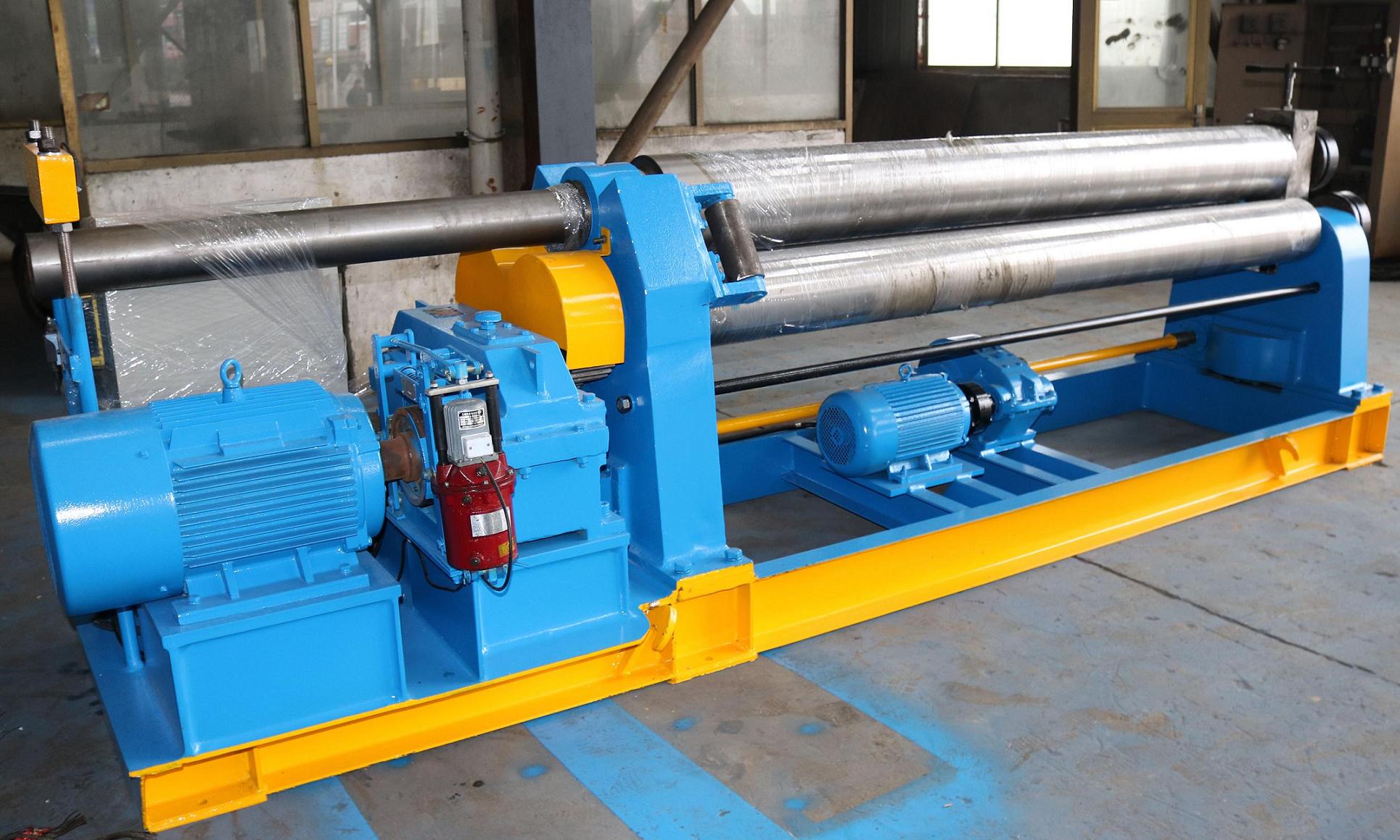W11對稱卷板機是全機械對稱式三輥卷板機。 三個滾筒全部固定,像金字塔一樣放置。